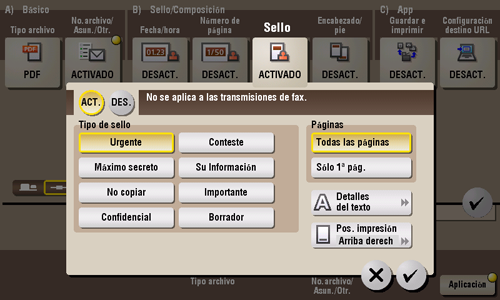 El texto como, por ejemplo, "Conteste" y "No copiar" se imprime en la primera página o en todas las páginas. Es posible seleccionar el texto que debe imprimirse de entre los sellos fijos registrados y los sellos registrados arbitrarios.