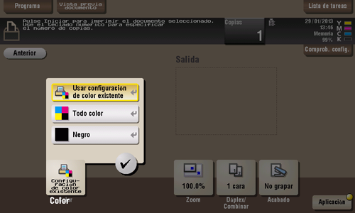 [Usar configuración de color existente] | Imprime un archivo en el mismo modo de color que el utilizado durante el almacenamiento. |