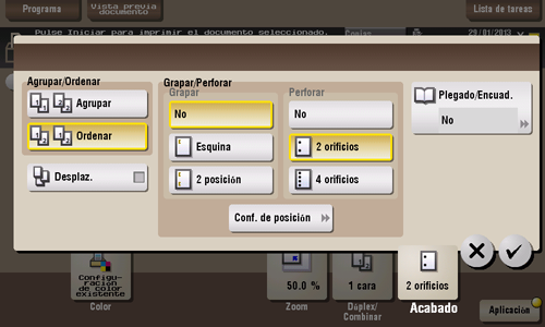 [Conf. de posición] | Seleccione una posición para perforar. Si la posición de perforación se ha ajustado a [Auto], la posición para perforar se determina de forma automática en función de la dirección del archivo de impresión. |