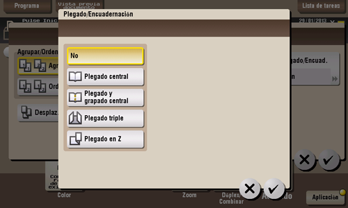 [Plegado central] | Se obtiene una hoja impresa plegada en dos. Para obtener más información, consulte Aquí. |