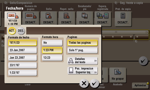 Es posible seleccionar una posición y formato de impresión, y añadir la fecha y hora. La fecha y hora pueden imprimirse en todas las páginas o únicamente en la primera.