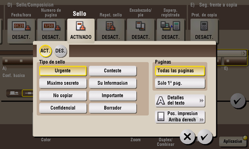 El texto como, por ejemplo, "Conteste" y "No copiar" se imprime en la primera página o en todas las páginas. Es posible seleccionar el texto que debe imprimirse de entre los sellos fijos registrados y los sellos registrados arbitrarios.