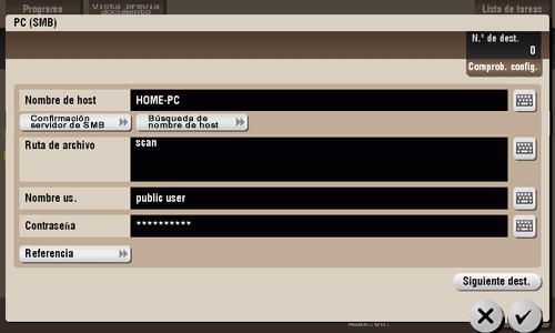 En el panel táctil, busque el ordenador al que desea enviar un archivo y seleccione una carpeta compartida de destino. Cuando aparezca la pantalla de autenticación, introduzca el nombre y la contraseña de un usuario que tenga privilegios de acceso a la carpeta seleccionada. Después de la autenticación, se introduce automáticamente el [Nombre de host] o la [Ruta de archivo]. La función Referencia puede fallar en las siguientes condiciones.