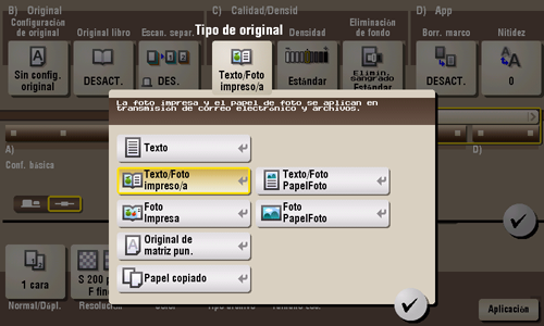 [Texto/Foto impreso/a] | Toque este botón para escanear un original que consiste fundamentalmente en texto y fotos al nivel óptimo de calidad de imagen. Esta función acentúa los bordes del texto y reproduce fotos más suaves. Seleccione esta opción para escanear originales impresos como, por ejemplo, folletos y catálogos. |