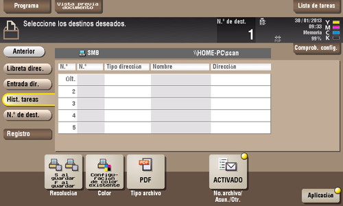 Pulse [Hist. tareas] y puede seleccionar un destino desde el historial de escáner o fax. Las últimas tareas (hasta cinco) se muestran para fines del historial. Cuando sea necesario, es posible seleccionar varios destinos desde el historial.