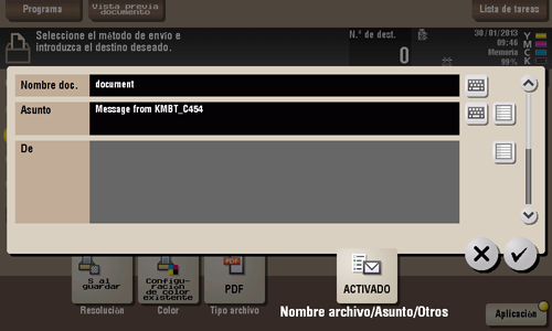 Al enviar por correo electrónico, puede especificar el texto del asunto y del mensaje de un correo electrónico y modificar la dirección de correo electrónico del remitente (dirección "De").