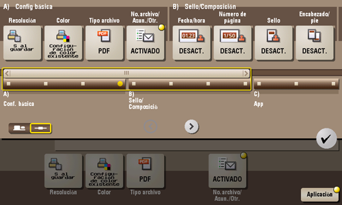 [App] | Configura las opciones de la aplicación para notificar el almacenamiento de los datos del archivo por correo electrónico, para modificar la información del remitente del fax y otras. |