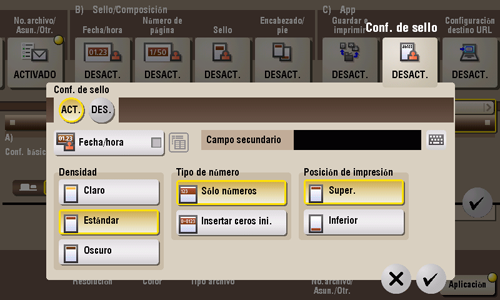 [Fecha/hora] | Seleccione un formato para la fecha y hora que debe imprimirse. Seleccione la casilla [Fecha/hora] y toque el icono de la parte derecha de la pantalla; a continuación, se puede seleccionar un formato de Fecha/hora desde el menú de acceso directo. |