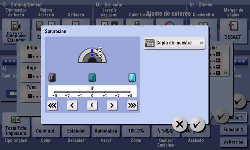 [Copia de muestra] | Puede comprobar el acabado imprimiendo una copia de muestra. Coloque el original en el cristal de originales y toque [Aceptar] o pulse Inicio. |