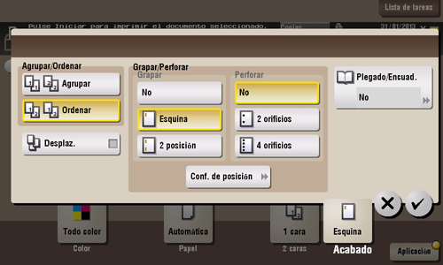 [2 posición] | Cada juego de hojas impresas se grapa en dos posiciones (en la parte superior, izquierda o derecha) antes de expulsarlo. |