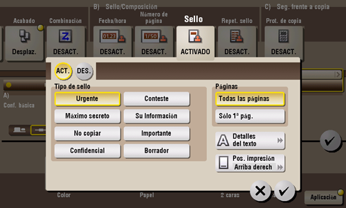 El texto como, por ejemplo, "Conteste" y "No copiar" se imprime en la primera página o en todas las páginas. Es posible seleccionar el texto que debe imprimirse de entre los sellos fijos registrados y los sellos registrados arbitrarios.