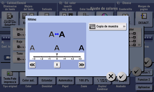 [Copia de muestra] | Puede comprobar el acabado imprimiendo una copia de muestra. Coloque el original en el cristal de originales y toque [Aceptar] o pulse Inicio. |