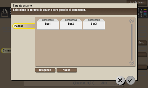 Esta ventana se utiliza para buscar una carpeta de usuario. Las carpetas de usuario se muestran en función de los caracteres de búsqueda que se hayan especificado durante el registro de carpetas.