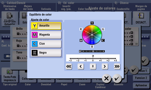 Ajuste la densidad de los colores amarillo (Y), magenta (M), cian (C), y negro (K). Cambiando la cantidad de cada uno de los cuatro tóners, pueden ajustarse los matices de la copia.