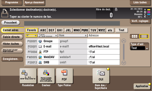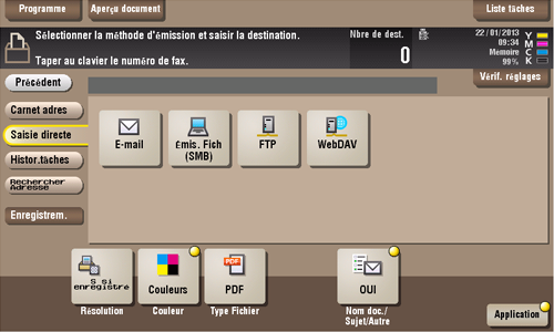 L'émission par diffusion est possible en sélectionnant plusieurs destinations. La diffusion peut également être utilisée pour d'autres fonctions de transfert de fichier telles que les e-mails simultanés et le transfert de fichier SMB.