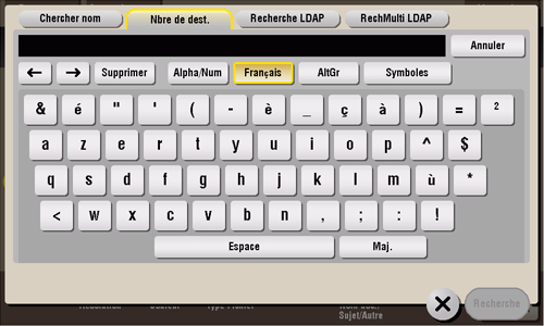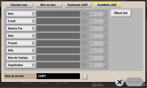 Il existe deux moyens d'effectuer une recherche : [Recherche LDAP] pour rechercher une adresse e-mail ou un numéro de fax avec un seul mot-clé et [RechMulti LDAP] pour rechercher une adresse e-mail ou un numéro de fax en combinant des mots-clés de différentes catégories.