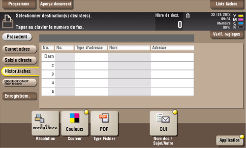 Tapez sur [Histor. tâches], puis sélectionnez une destination depuis l'historique des numérisations ou des fax.