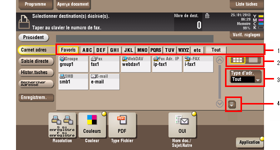 2 | Affiche les destinations enregistrées soit sous forme de boutons ou de liste. En cas de passage à l'affichage en liste, vous pouvez trier les destinations par numéros d'enregistrement, types de destination ou dans l'ordre alphabétique des noms de destination. |