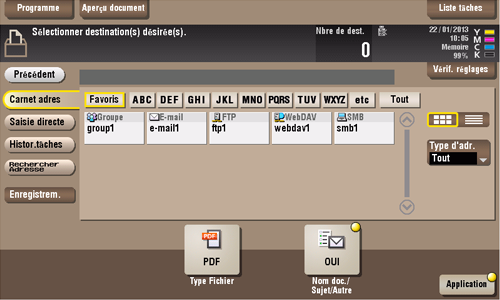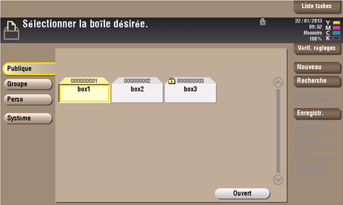Cet exemple utilise la boîte utilisateur public pour les explications. Pour utiliser une boîte utilisateur privé ou une boîte Groupe, tapez sur [Perso] ou [Groupe] et sélectionnez la boîte désirée.