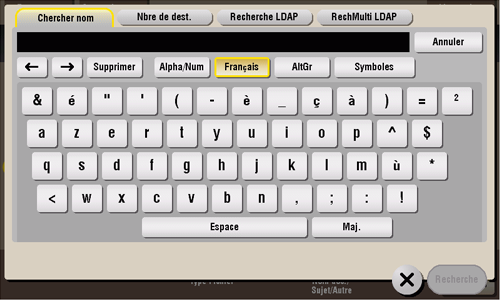 Il existe deux moyens d'effectuer une recherche : [Recherche LDAP] pour rechercher une adresse e-mail avec un seul mot-clé et [RechMulti LDAP] pour rechercher une adresse e-mail en combinant des mots-clés de différentes catégories.
