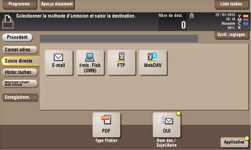 L'émission par diffusion est possible en sélectionnant plusieurs destinations. La diffusion peut également être utilisée pour d'autres fonctions de transfert de fichier telles que les e-mails simultanés et le transfert de fichier SMB.