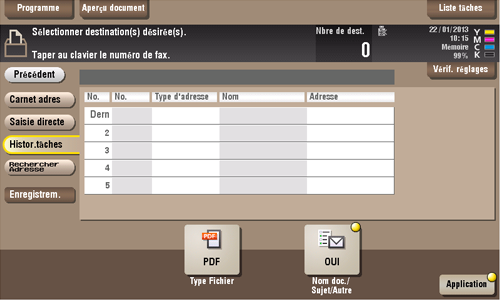 Tapez sur [Histor. tâches], puis sélectionnez une destination depuis l'historique des numérisations ou des tâches archivées.