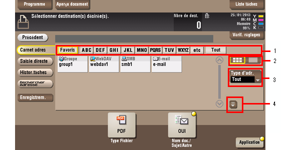 2 | Affiche les destinations enregistrées soit sous forme de boutons ou de liste. En cas de passage à l'affichage en liste, vous pouvez trier les destinations par numéros d'enregistrement, types de destination ou dans l'ordre alphabétique des noms de destination. |