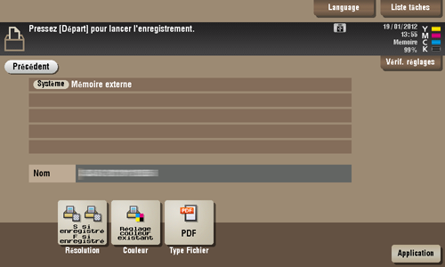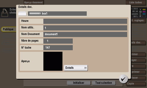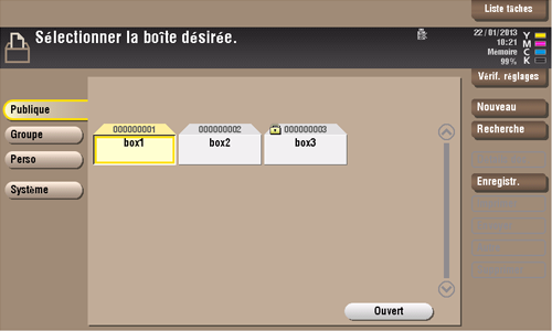 Cet exemple utilise la boîte utilisateur public pour les explications. Pour utiliser une boîte utilisateur privé ou une boîte Groupe, tapez sur [Perso] ou [Groupe] et sélectionnez la boîte désirée.