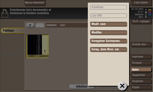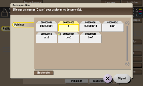 Sélectionnez un fichier, puis tapez sur [Recomposition]. Vous pouvez maintenant déplacer le fichier dans une autre boîte utilisateur. La destination peut être une boîte utilisateur Publique, Perso ou Groupe. Sélectionnez une boîte utilisateur de destination, puis tapez sur [Départ] ou appuyez sur la touche Départ.