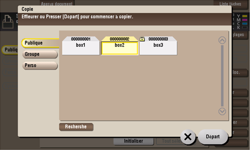Sélectionnez un fichier, puis tapez sur [Copie]. Vous pouvez maintenant copier le fichier dans une autre boîte utilisateur. Sélectionnez la destination boîte utilisateur Publique, Perso ou Groupe. Sélectionnez une boîte utilisateur de destination, puis tapez sur [Départ] ou appuyez sur la touche Départ.
