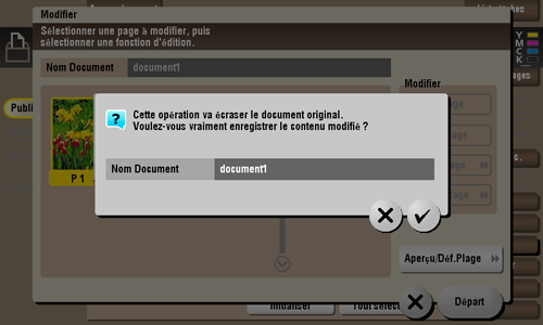 [Suppr. page] | Supprime une ou des pages sélectionnées. Vous pouvez par exemple supprimer les pages vierges afin de réduire le volume des données. Vous pouvez aussi effleurer longuement le fichier cible pour afficher l'icône de menu, puis le glisser et le déposer sur |