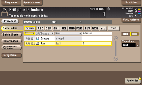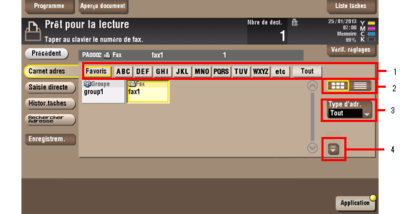 2 | Affiche les destinations enregistrées soit sous forme de boutons ou de liste. En cas de passage à l'affichage en liste, vous pouvez trier les destinations par numéros d'enregistrement, types de destination ou dans l'ordre alphabétique des noms de destination. |