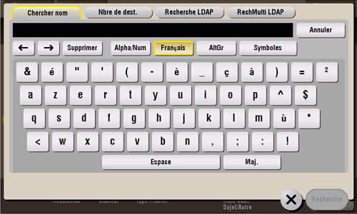 Si le nombre de destinations enregistré est important, vous pouvez rechercher une destination par nom d'enregistrement ou destination (adresse e-mail ou nom PC).