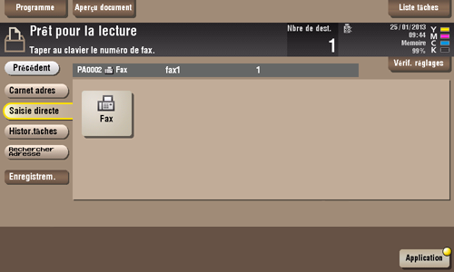 Sélectionnez [Saisie directe], tapez sur [Fax] et entrez un numéro de fax.