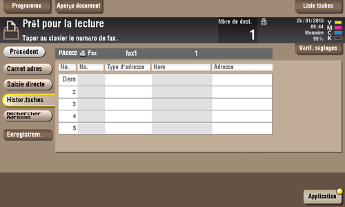 Tapez sur [Histor. tâches], puis sélectionnez une destination depuis l'historique des numérisations ou des fax.
