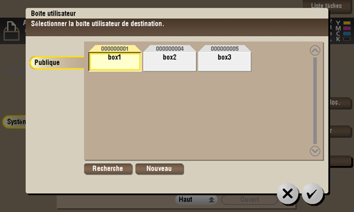 Sélectionnez une boîte utilisateur pour y enregistrer un fichier, puis tapez sur [Valider].