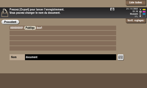 Lorsque vous enregistrez un fichier PDF protégé par un mot de passe, le fichier est archivé dans la boîte PDF Crypté Mot de Passe. Pour enregistrer un fichier dans une boîte utilisateur depuis la Boîte PDF Crypté Mot de Passe sélectionnée, voir ici.
