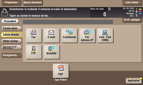 L'émission par diffusion est possible en sélectionnant plusieurs destinations. La diffusion peut également être utilisée pour d'autres fonctions de transfert de fichier telles que les e-mails simultanés et le transfert de fichier SMB.
