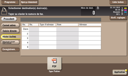 Tapez sur [Histor. tâches], puis sélectionnez une destination depuis l'historique des numérisations ou des tâches archivées.