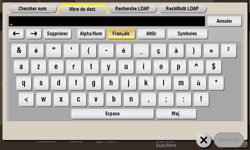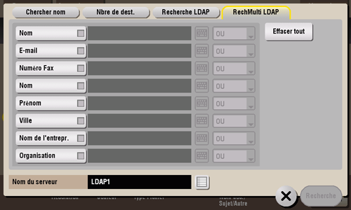 Il existe deux moyens d'effectuer une recherche : [Recherche LDAP] pour rechercher une adresse e-mail avec un seul mot-clé et [RechMulti LDAP] pour rechercher une adresse e-mail en combinant des mots-clés de différentes catégories.