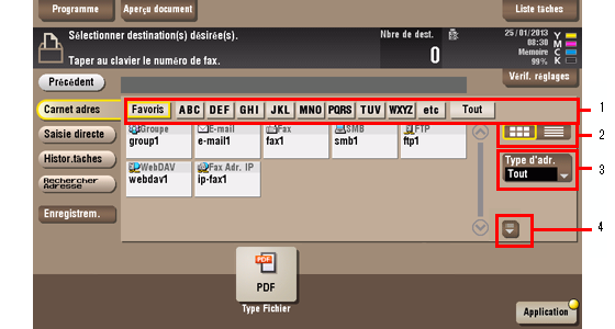 2 | Affiche les destinations enregistrées soit sous forme de boutons ou de liste. En cas de passage à l'affichage en liste, vous pouvez trier les destinations par numéros d'enregistrement, types de destination ou dans l'ordre alphabétique des noms de destination. |
