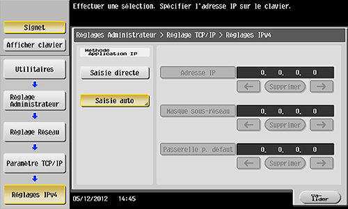 Administrateur] - [Réglage Réseau] - [Paramètre TCP/IP] - [Réglages IPv4] puis configurez le paramètre