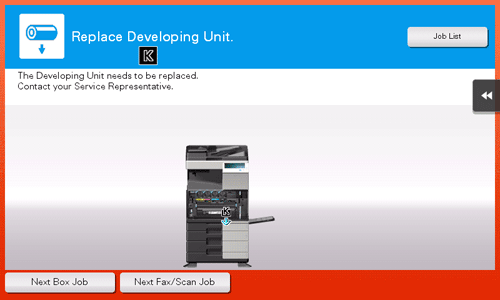 Quand il est temps de remplacer l'unité de développement d'une couleur autre que le noir, vous pouvez imposer la poursuite de l'impression en noir. Tapez sur [Continuer], puis sélectionnez un travail d'impression souhaité.