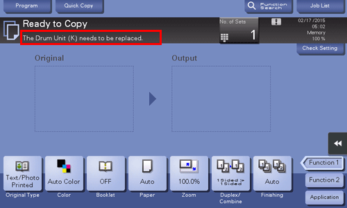 Quand il est temps de remplacer une Unité tambour, un message vous invitant à la remplacer apparaît. Remplacez-la en fonction du contrat d'entretien. Tapez sur [Lancer Assistant] pour afficher la procédure de remplacement à l'écran et la vérifier.