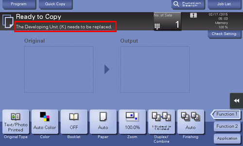 Quand il est temps de remplacer une Cartouche de toner, un message vous invitant à la remplacer apparaît. Remplacez-la en fonction du contrat d'entretien. Tapez sur [Lancer Assistant] pour afficher la procédure de remplacement à l'écran et la vérifier.