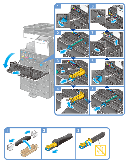 Ihr Servicemitarbeiter sammelt gebrauchte Trommeleinheiten wieder ein. Bewahren Sie die Bildeinheit in schwarze Kunststofffolie verpackt separat in einer Box auf.