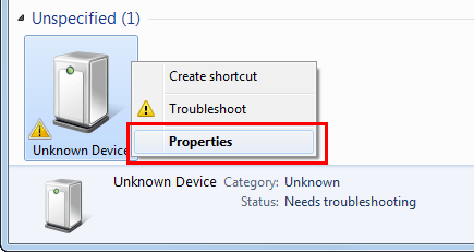 Klicken Sie mit der rechten Maustaste auf den Gerätenamen oder [Unbekanntes Gerät] für eine in der Kategorie [Nicht festgelegt] angezeigte Authentifizierungseinheit, und klicken Sie anschließend auf [Eigenschaften].
