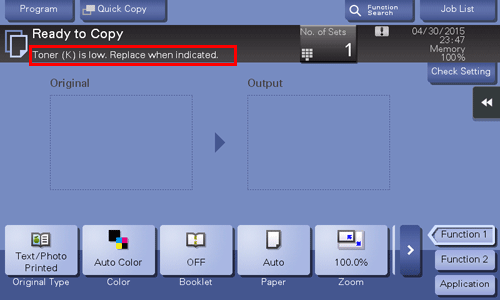 When it is almost time to replace a Toner Cartridge, an advanced warning message appears. Prepare a replacement Toner Cartridge based on the maintenance contract.