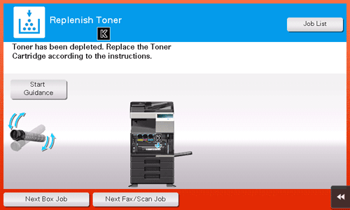 When it is time to replace a Toner Cartridge, a replacement prompt message appears. Replace it based on the maintenance contract. Tap [Start Guidance] to display the replacement procedure on the screen and check it.