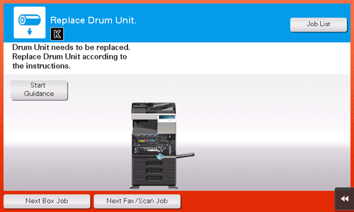 When it is time to replace a Drum Unit, a replacement prompt message appears. Replace it based on the maintenance contract. Tap [Start Guidance] to display the replacement procedure on the screen and check it.